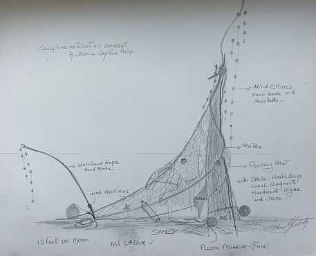 A Silent Cry for Help is a sculptural meditation on marine extinction and human neglect. Constructed from reclaimed oceanic debris—fishing nets, plastic remnants, and coral fragments—it immerses viewers in a monochrome seascape of loss. Suspended geometric forms and handmade wind chimes evoke a fragile, vanishing world, while a haunting soundscape of whale calls reverberates through the space. This project is not a lament for what is lost—it is a call to protect what remains. Presented during Climate Week 2025, this immersive installation seeks to transform ecological data into visceral truth through art.